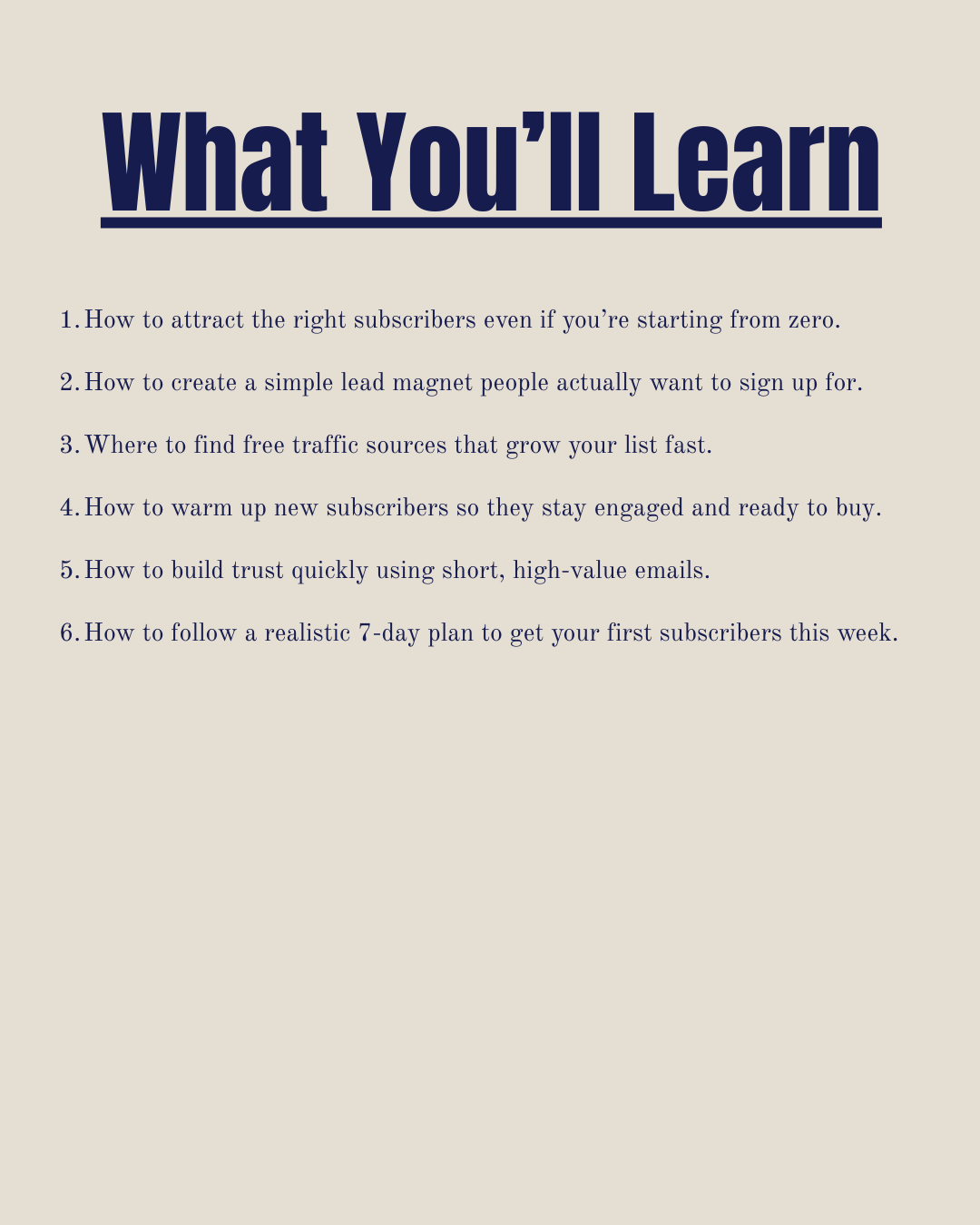 Inside, you’ll learn exactly how to attract the right subscribers, create an irresistible lead magnet, use the best free traffic sources, warm up new subscribers, and build trust quickly. You’ll also follow a simple 7-day action plan that helps you get your first subscribers this week.